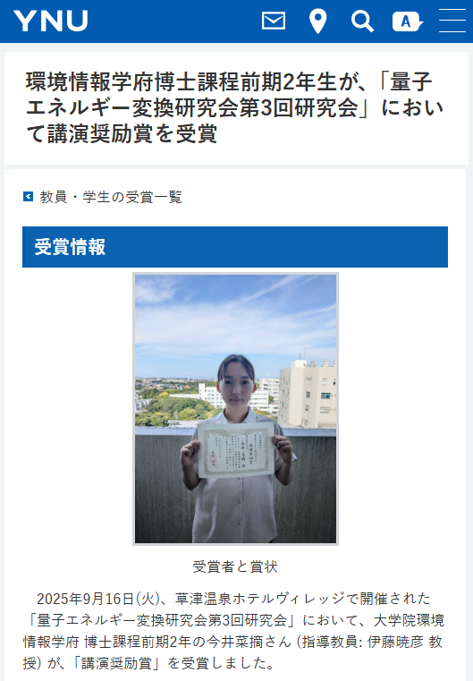 伊藤研究室からは、今井、敷地、金本、成合、西巻が参加して、研究成果をオンラインでポスター発表しました。研究発表を評価して頂き、今井が講演奨励賞を受賞することができました。研究内容と受賞者の写真を添えた学府や学部のリリースは、次の通りです:今井