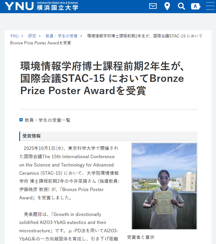 発表題目は、「Al2O3-YbAG共晶体の合成と引き下げ条件が微細組織形成に及ぼす影響」です。YbAGは、選択的な熱放射体や希土類添加による放射線誘起蛍光体としての応用が期待される材料ですが、この共晶体の結晶育成パラメータが微細組織形成に与える影響を明らかにしました。今井さんの優れた発表内容およびプレゼンテーション能力が評価され、今回の受賞となりました。
